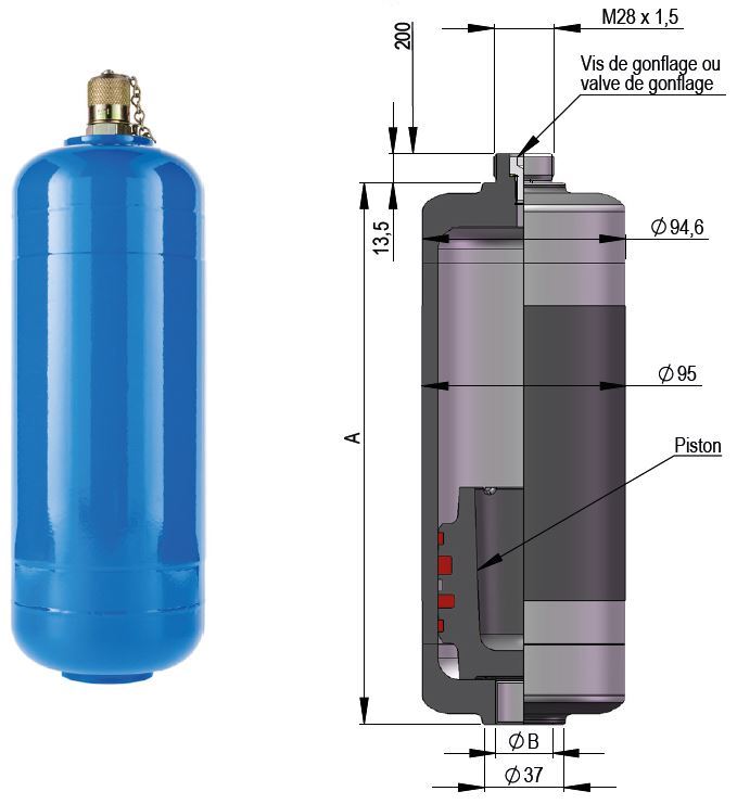 Infos supplémentaires Pression gonflage azote 30 Bars Pression de service max 250Bar Implantation G3/4 Ø95mm Code Hydro Leduc : APL1.5D0811VN30 Ancienne codification APL1.5D08G3VNN30 Accumulateur à piston 1.5L - max 250bar - G3/4 - P0=030bar - APL AP1500030L