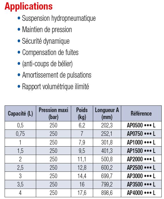 Infos supplémentaires Volume 4 litre Pression gonflage azote 50 Bar Pression de service max 250Bar Implantation G3/4 Ø95 mm Code Hydro Leduc : APL4D0811VN50 Ancienne codification APL4D08G3VNN50 Accumulateur à piston 4L - max 250bar - G3/4 - P0=050bar - APL AP4000050L