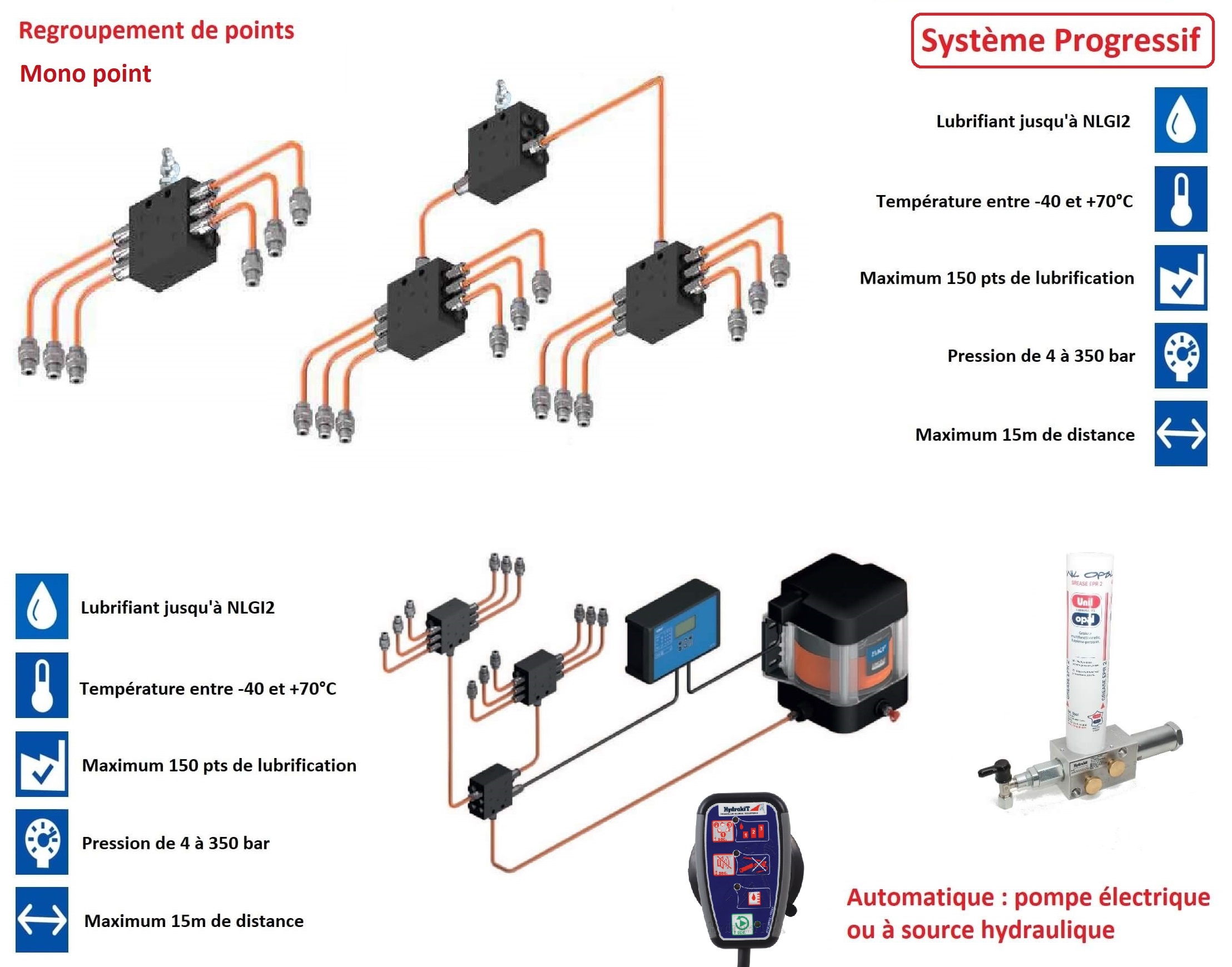 Du simple regroupement de points, à la pompe électrique avec automate de gestion de cycles en passant par la pompe à source hydraulique, il y a forcément le système qui correspond à votre demande.
