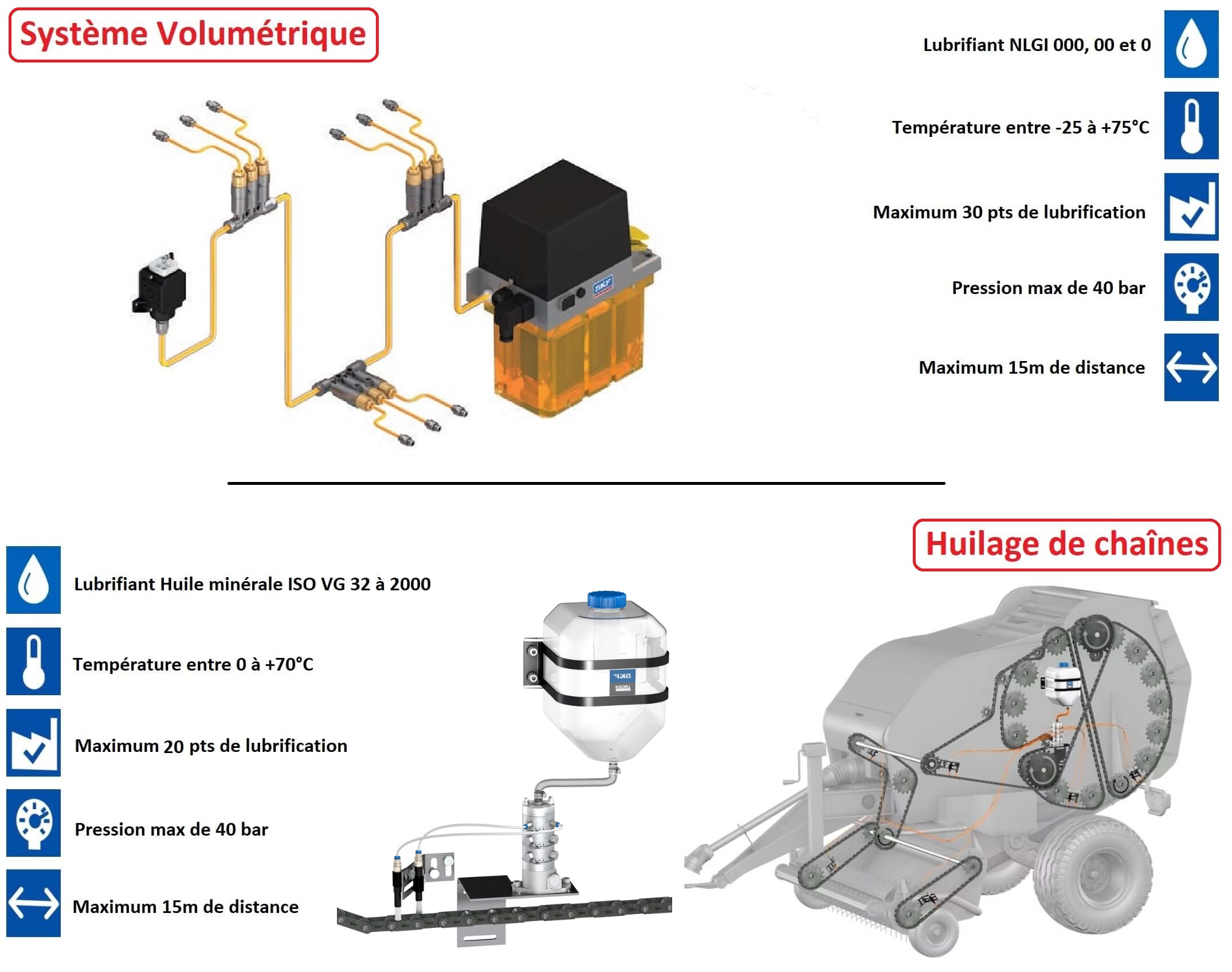 - Système de lubrification multilignes par répartition pour de la graisse jusqu'au grade NLGI 2. Pression maximum de 350 bar. Il permet de distribuer une quantité de lubrifiant précisément dosée vers un grand nombre de points (jusqu’à 150).