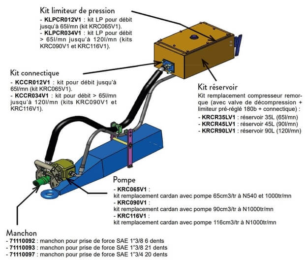 Les kits varient en fonction de vos besoins (puissance souhaitée, débit disponible au tracteur, vitesse de rotation souhaitée, etc)