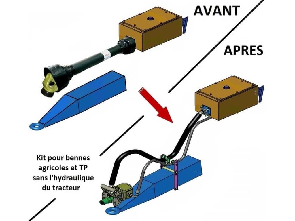 Die Kits variieren je nach Ihren Bedürfnissen (gewünschte Leistung, verfügbare Fördermenge des Traktors, gewünschte Rotationsgeschwindigkeit, ...).