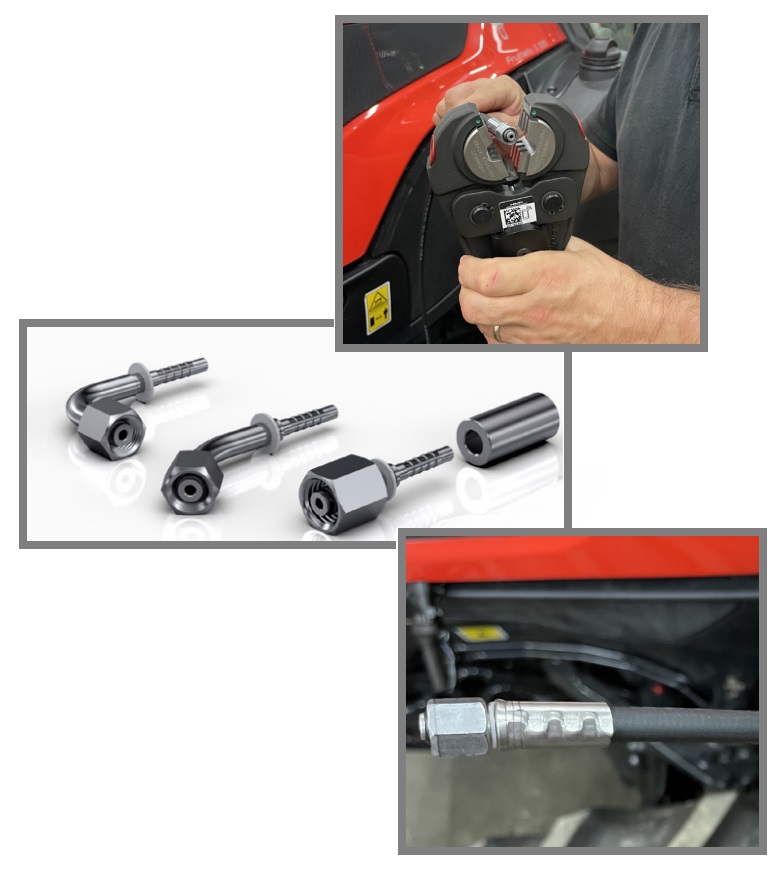 Durch die Verwendung von speziellen Endstücken und einem kabellosen Crimpgerät können Sie den Schlauch direkt auf der Maschine crimpen und montieren.