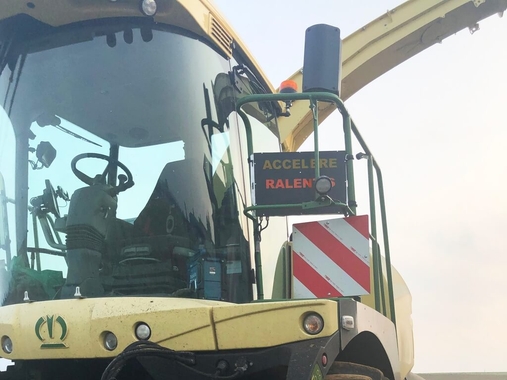 With a view to continuously improving the safety of equipment, Hydrokit has developed a new innovative solution selected at the SIMA Awards 2021 which enables the exchange of information between drivers. A panel with a luminous text is installed on the side of the self-propelled truck's cab allowing it to be seen by the trailer driver. The self-propelled driver can thus indicate to the trailer driver to move forward or slow down depending on the filling during threshing or silage work.