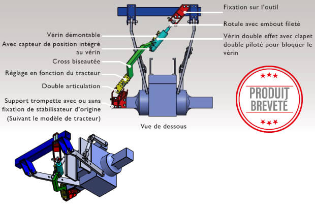 The principle is based on a deformation of the current 3-point linkage. The kit includes a fitting to be installed on the tractor's trumpet and another on the implement. A bar with a so-called 4th point cylinder links the two fittings together. When the cylinder is operated, the assembly moves the implement to the right or left..