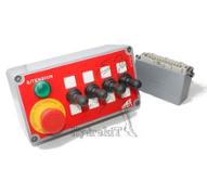 Additional info FIX CONTROL BOX - Suitable for standard electric cabinet: ADTxxxxxx - Number of double-acting function: 4 - Sturdy polyester resin box IP65 - Functions controlled by long lever switches - Cable length: 3,000mm - Electric plug: 24 pins - Emergency stop button wired with NV2 safety level 4 DOUBLE-ACTING FIX CONTROL BOX FOR ELECTRIC CABINET BADT4DE02