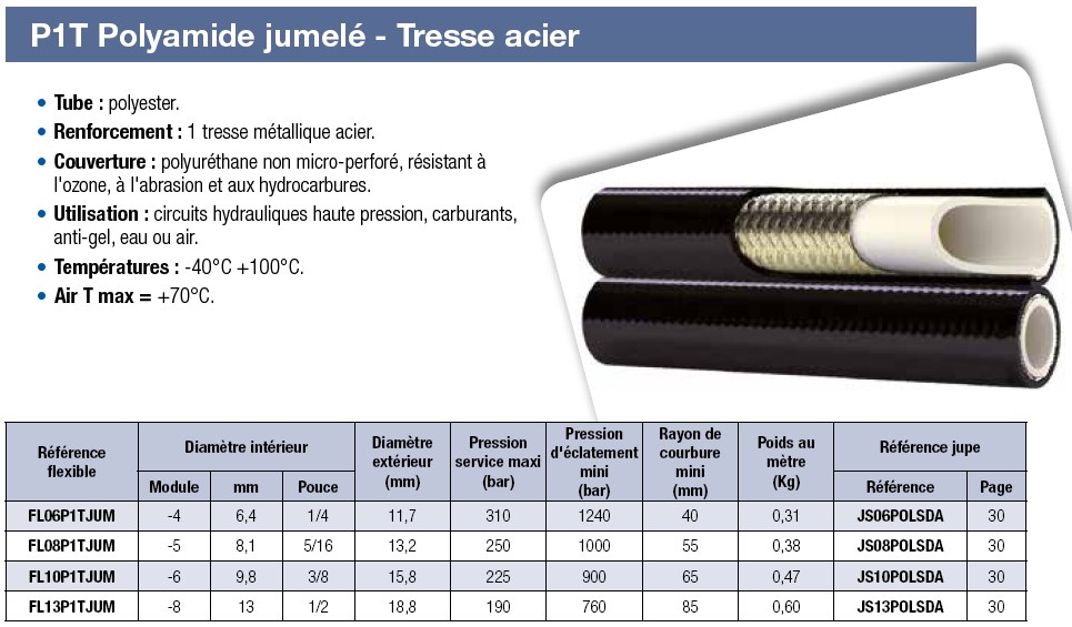 Infos supplémentaires TRESSE ACIER - Jumellé Ref Dunlop Hiflex 1000267 Flexible Ø13 1/2 polyamide jumelé tresse acier P1T 190 bar FL13P1TJUM
